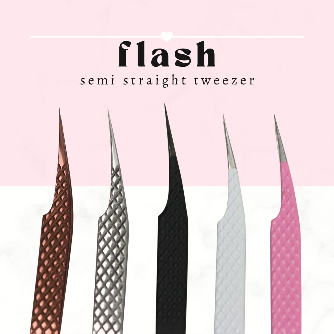 Our FLASH Semi Straight Isolation tweezer makes all the difference for easy isolation during lash extension application! Our straight tweezer is different than most as the bend on the tweezer allows you to follow the natural curve on your clients eyelid. This short and lightweight tweezer makes lashing inner and outer corners are breeze!