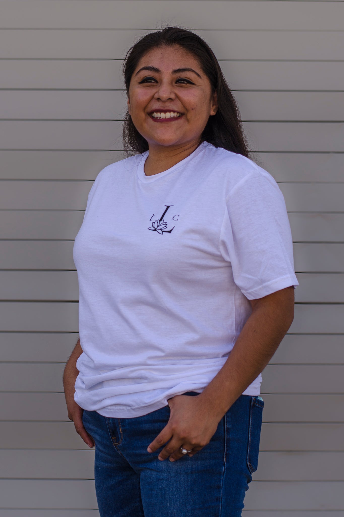 White Shirt has skull on the back (Violeta wearing M, Jesse wearing 2XL)